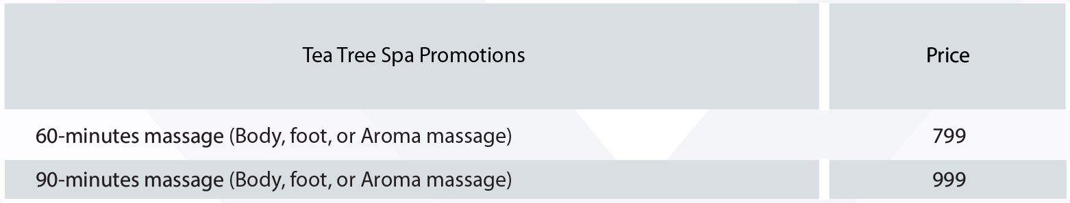 - Resort credit THB 300 net/room/night to be used on a la carte, non-alcohol beverages and not applicable with in-room dining