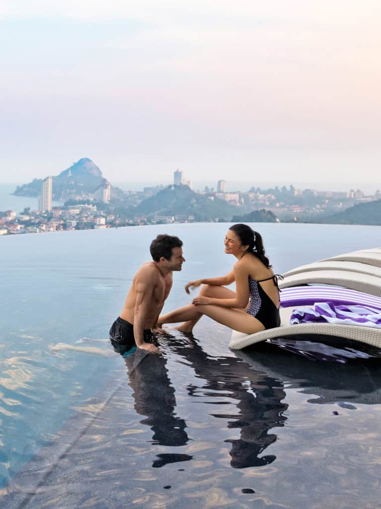 Swim, splash, float, and glide with the best views at our infinity pool in Hua Hin, consisting of two stunning edgeless pools that blend seamlessly with the horizon. Recline on lounge chairs on the shallow steps of the pool, or set up for the day on our covered pool deck with enough room to relax, read, and play.